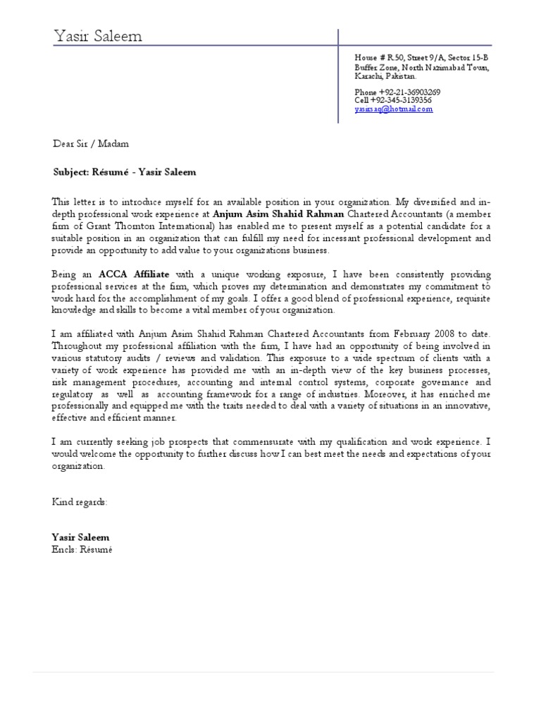 I am professionally qualified acca certified financial accountant and also hold a higher . Assuming everyone else applying is equally qualified with the same or similar degree, your cover letter is your chance to argue your case about why you're a . I have 4 years of experience in auditing, accounts and finance. My experience aligns well with the qualifications you are seeking at perkins accounting, in particular my role as a trainee accountant at capstone accounting, . A cover letter accompanies your cv application (and/or completed.